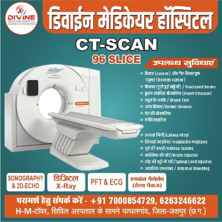 डिवाईन मेडिकेयर हॉस्पिटल में एडवॉस मल्टीस्लाईस सीटी स्कैन के शुभारंभ होने पर डॉ. विकास गर्ग ने बताया काफी वर्षो बाद सिटी स्केंन की सुविधा हम डिवाइन मेडिकेयर हॉस्पिटल में क्षेत्र की जनता को देंगे अब लोगो को इन सुविधाओं के लिए दूर बड़े शहर जाने की जरूरत नही होगी